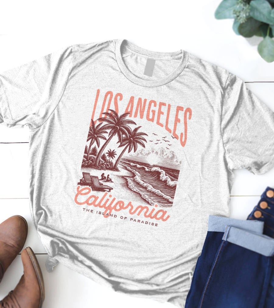 Los Angeles California The Island of Paradise Vintage Beach Shirt made from 100% pre-shrunk ring-spun cotton, unisex regular fit based on U.S. standard sizing. The shirt is designed, cut, sewn, and printed in the United States. Available in sizes S-5XL.
