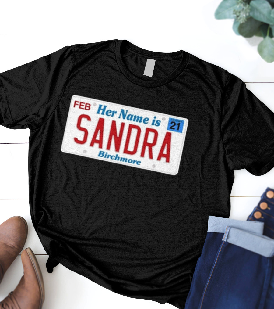 Her Name is Sandra Birchmore License Plate Design FEB 21 Shirt made from 100% pre-shrunk ring-spun cotton, unisex regular fit based on U.S. standard sizing. The shirt is designed, cut, sewn, and printed in the United States. Available in sizes S-5XL.