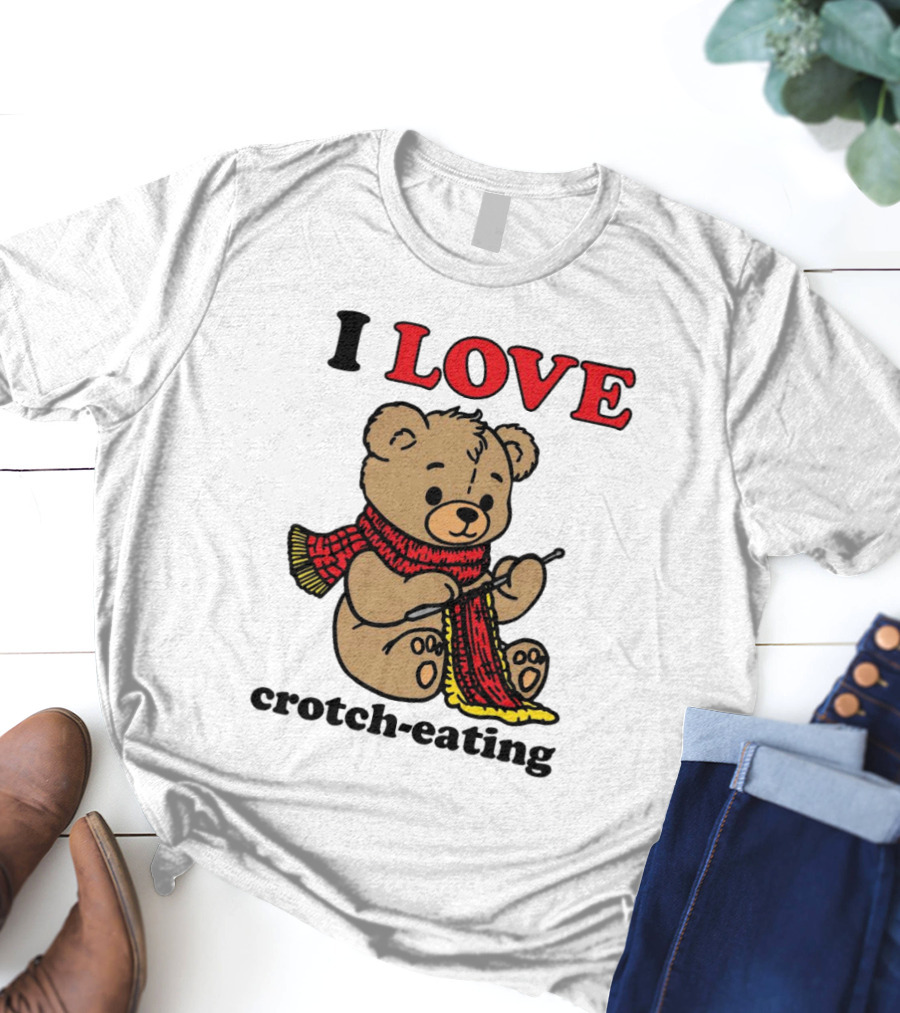 I Love Crotch-Eating Bear Wearing Scarf and Knitting Shirt made from 100% pre-shrunk ring-spun cotton, unisex regular fit based on U.S. standard sizing. The shirt is designed, cut, sewn, and printed in the United States. Available in sizes S-5XL.