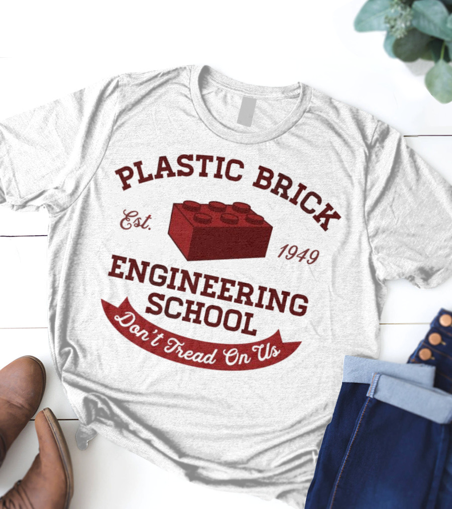 Plastic Brick Engineering School Est. 1949 Don't Tread On Us LEGO Brick Building Shirt made from 100% pre-shrunk ring-spun cotton, unisex regular fit based on U.S. standard sizing. The shirt is designed, cut, sewn, and printed in the United States. Available in sizes S-5XL.
