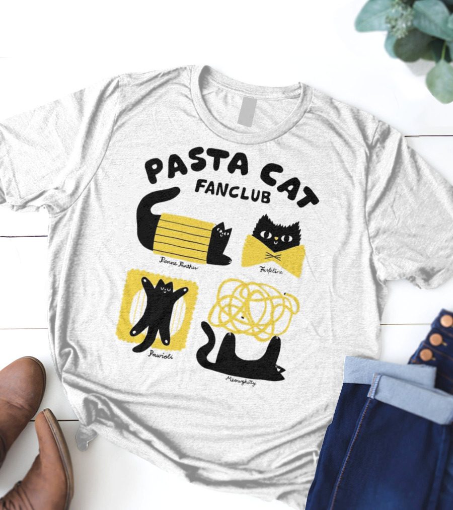 Pasta Cat Fanclub Penne Purrter ZitiFeline Pawrioli Meowgetty Shirt made from 100% pre-shrunk ring-spun cotton, unisex regular fit based on U.S. standard sizing. The shirt is designed, cut, sewn, and printed in the United States. Available in sizes S-5XL.