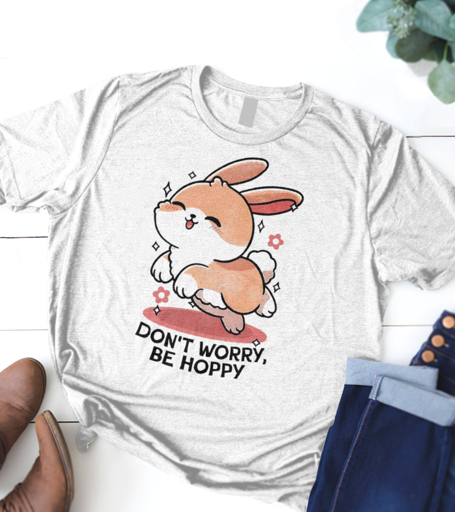 Don't Worry Be Hoppy Rabbit with Flowers and Hearts Shirt made from 100% pre-shrunk ring-spun cotton, unisex regular fit based on U.S. standard sizing. The shirt is designed, cut, sewn, and printed in the United States. Available in sizes S-5XL.