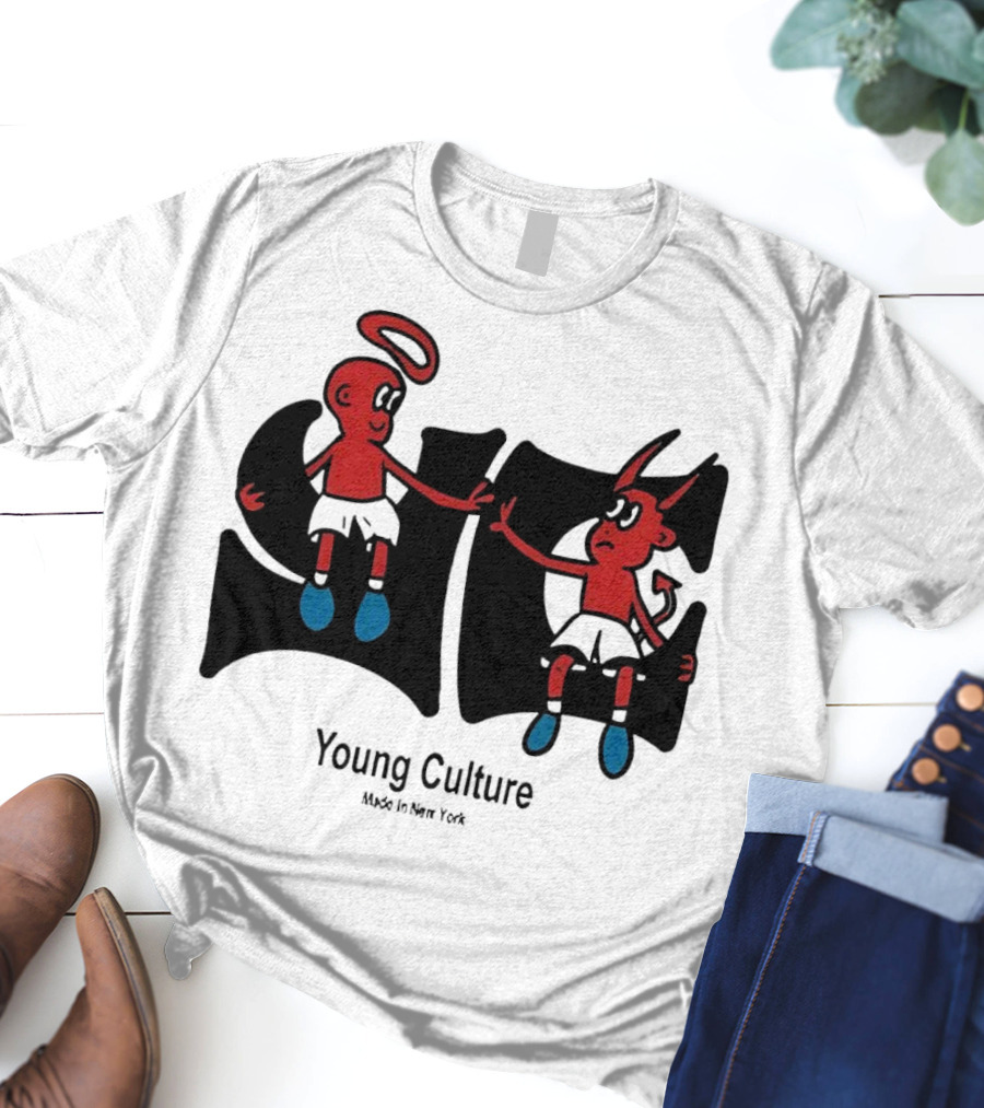 Young Culture Made in New York Best Buds Angel Devil Duo Shirt made from 100% pre-shrunk ring-spun cotton, unisex regular fit based on U.S. standard sizing. The shirt is designed, cut, sewn, and printed in the United States. Available in sizes S-5XL.