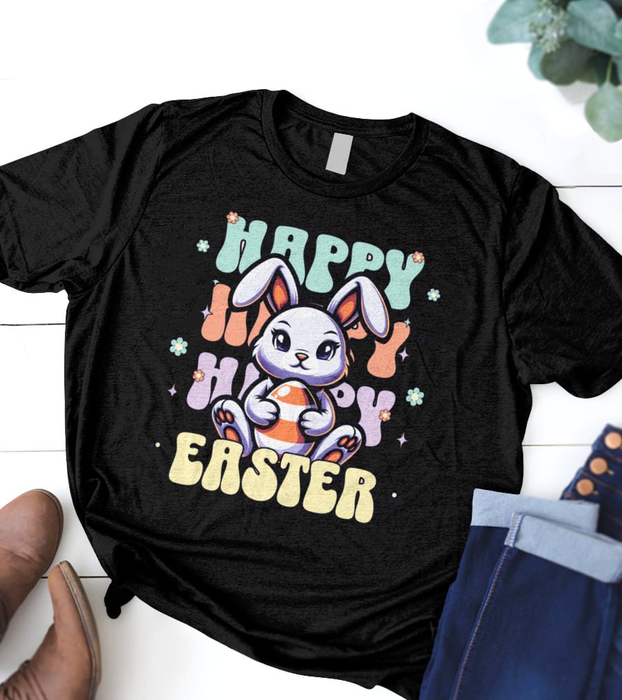 Happy Easter Bunny Holding Egg Pastel Flowers Shirt made from 100% pre-shrunk ring-spun cotton, unisex regular fit based on U.S. standard sizing. The shirt is designed, cut, sewn, and printed in the United States. Available in sizes S-5XL.