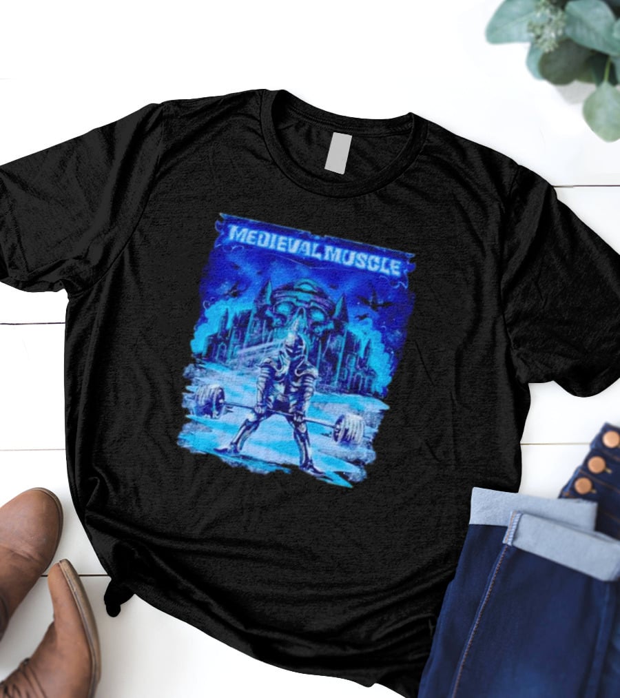Medieval Muscle Knight Lifting Weights in Gothic Castle Scene Shirt made from 100% pre-shrunk ring-spun cotton, unisex regular fit based on U.S. standard sizing. The shirt is designed, cut, sewn, and printed in the United States. Available in sizes S-5XL.