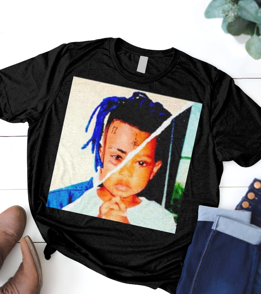 XXXTentacion Rapper Childhood and Adult Portrait Fusion Shirt made from 100% pre-shrunk ring-spun cotton, unisex regular fit based on U.S. standard sizing. The shirt is designed, cut, sewn, and printed in the United States. Available in sizes S-5XL.