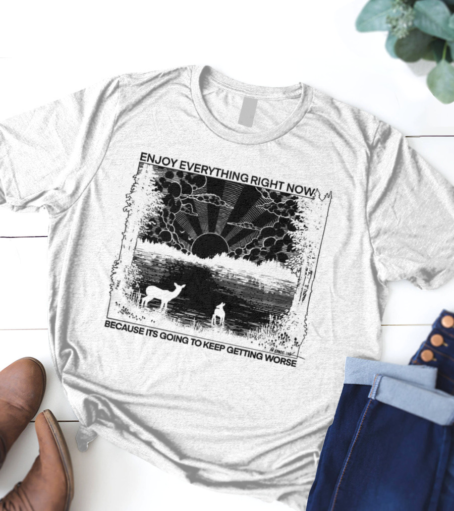 Enjoy Everything Right Now Because It Is Going To Keep Getting Worse Sunset Deer Forest Scene Shirt made from 100% pre-shrunk ring-spun cotton, unisex regular fit based on U.S. standard sizing. The shirt is designed, cut, sewn, and printed in the United States. Available in sizes S-5XL.