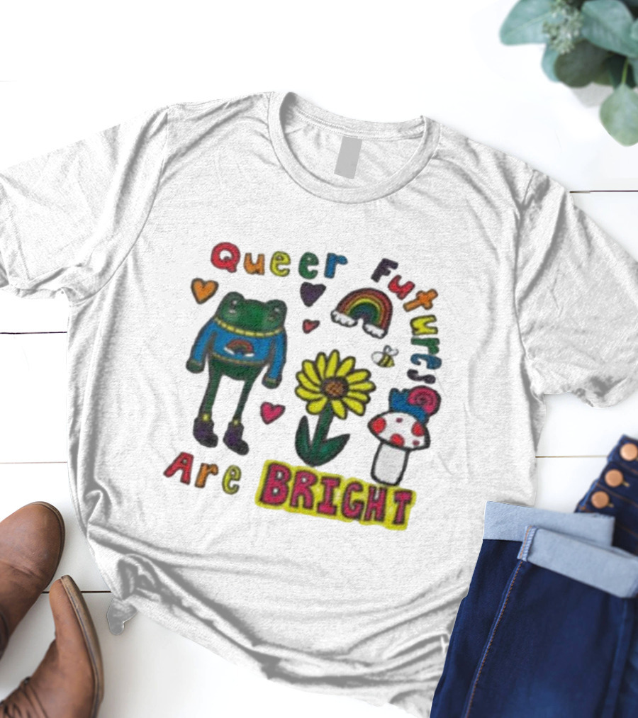 Queer Futures Are Bright Frog Rainbow Sunflower Mood Shirt made from 100% pre-shrunk ring-spun cotton, unisex regular fit based on U.S. standard sizing. The shirt is designed, cut, sewn, and printed in the United States. Available in sizes S-5XL.