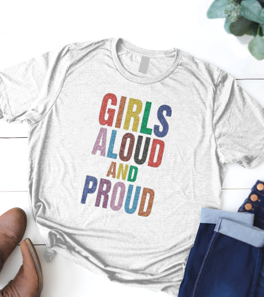 Girls Aloud and Proud Rainbow Pride Shirt made from 100% pre-shrunk ring-spun cotton, unisex regular fit based on U.S. standard sizing. The shirt is designed, cut, sewn, and printed in the United States. Available in sizes S-5XL.