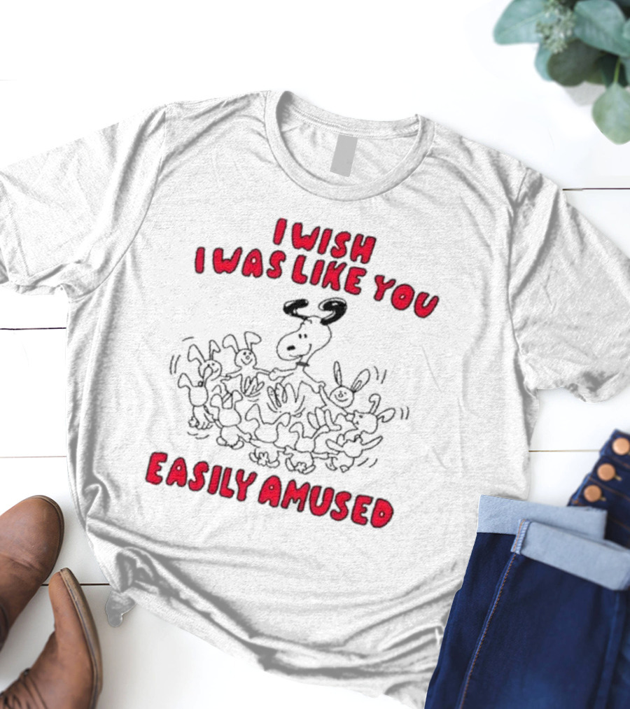 I Wish I Was Like You Easily Amused Surrounded by Dancing Cartoon Dogs Shirt made from 100% pre-shrunk ring-spun cotton, unisex regular fit based on U.S. standard sizing. The shirt is designed, cut, sewn, and printed in the United States. Available in sizes S-5XL.