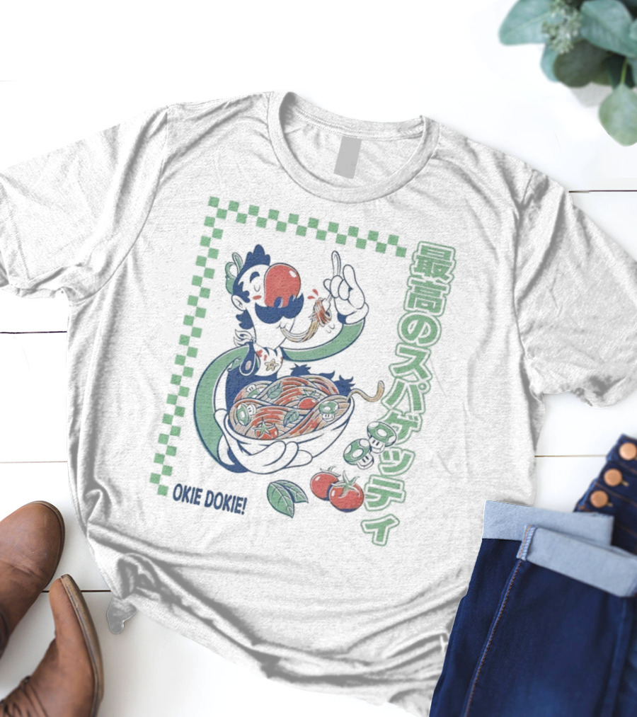 Luigi Okie Dokie Spaghetti Shirt made from 100% pre-shrunk ring-spun cotton, unisex regular fit based on U.S. standard sizing. The shirt is designed, cut, sewn, and printed in the United States. Available in sizes S-5XL.