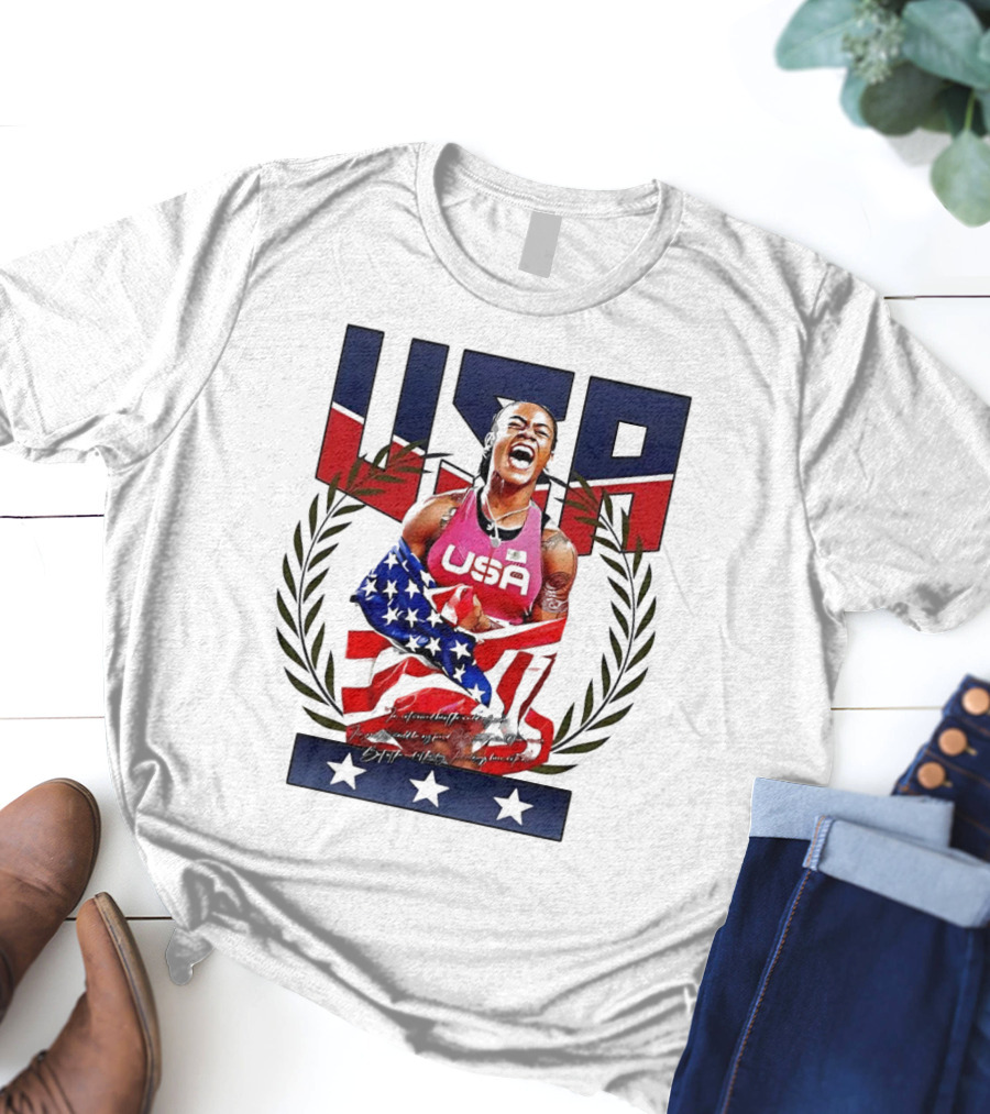 USA Sha’Carri Richardson Gold Medal Celebration American Flag Shirt made from 100% pre-shrunk ring-spun cotton, unisex regular fit based on U.S. standard sizing. The shirt is designed, cut, sewn, and printed in the United States. Available in sizes S-5XL.