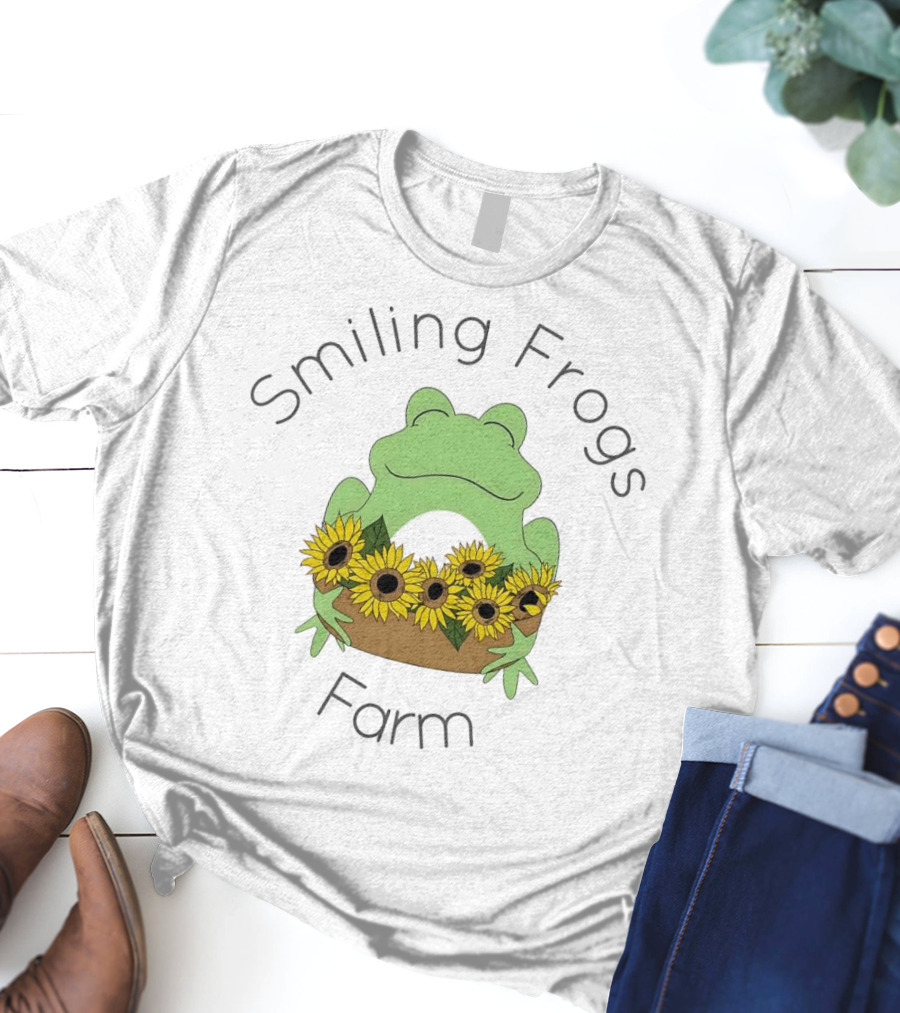 Smiling Frogs Farm Sunflowers Frogs Shirt made from 100% pre-shrunk ring-spun cotton, unisex regular fit based on U.S. standard sizing. The shirt is designed, cut, sewn, and printed in the United States. Available in sizes S-5XL.