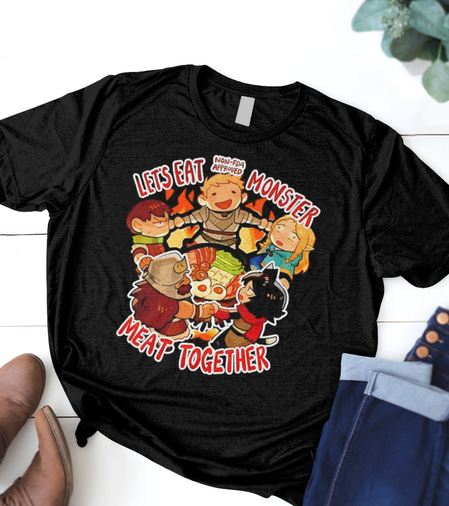 Let's Eat Monster Meat Together Non-FDA Approved Dungeon Meshi Shirt made from 100% pre-shrunk ring-spun cotton, unisex regular fit based on U.S. standard sizing. The shirt is designed, cut, sewn, and printed in the United States. Available in sizes S-5XL.