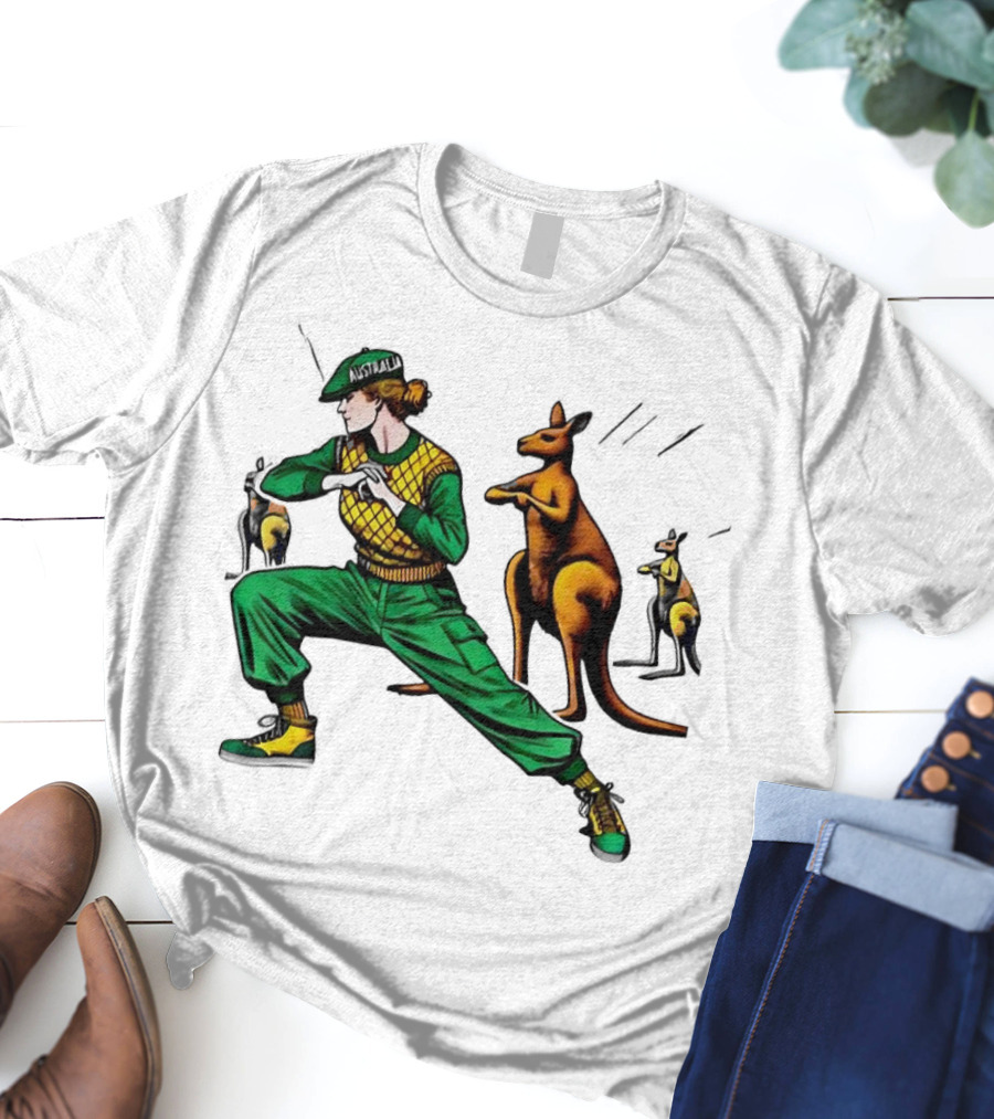 Breakdancing with Kangaroo at Olympics Shirt made from 100% pre-shrunk ring-spun cotton, unisex regular fit based on U.S. standard sizing. The shirt is designed, cut, sewn, and printed in the United States. Available in sizes S-5XL.