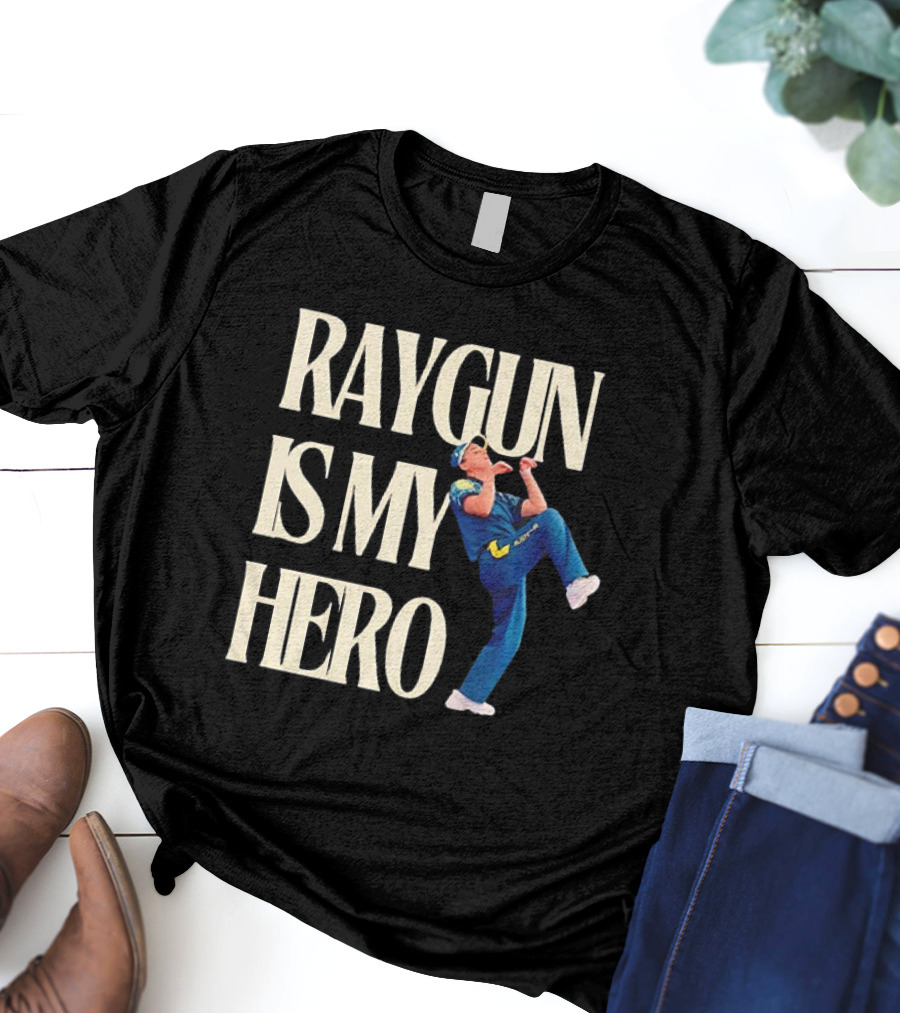 Raygun Is My Hero Pitching Pose Shirt made from 100% pre-shrunk ring-spun cotton, unisex regular fit based on U.S. standard sizing. The shirt is designed, cut, sewn, and printed in the United States. Available in sizes S-5XL.