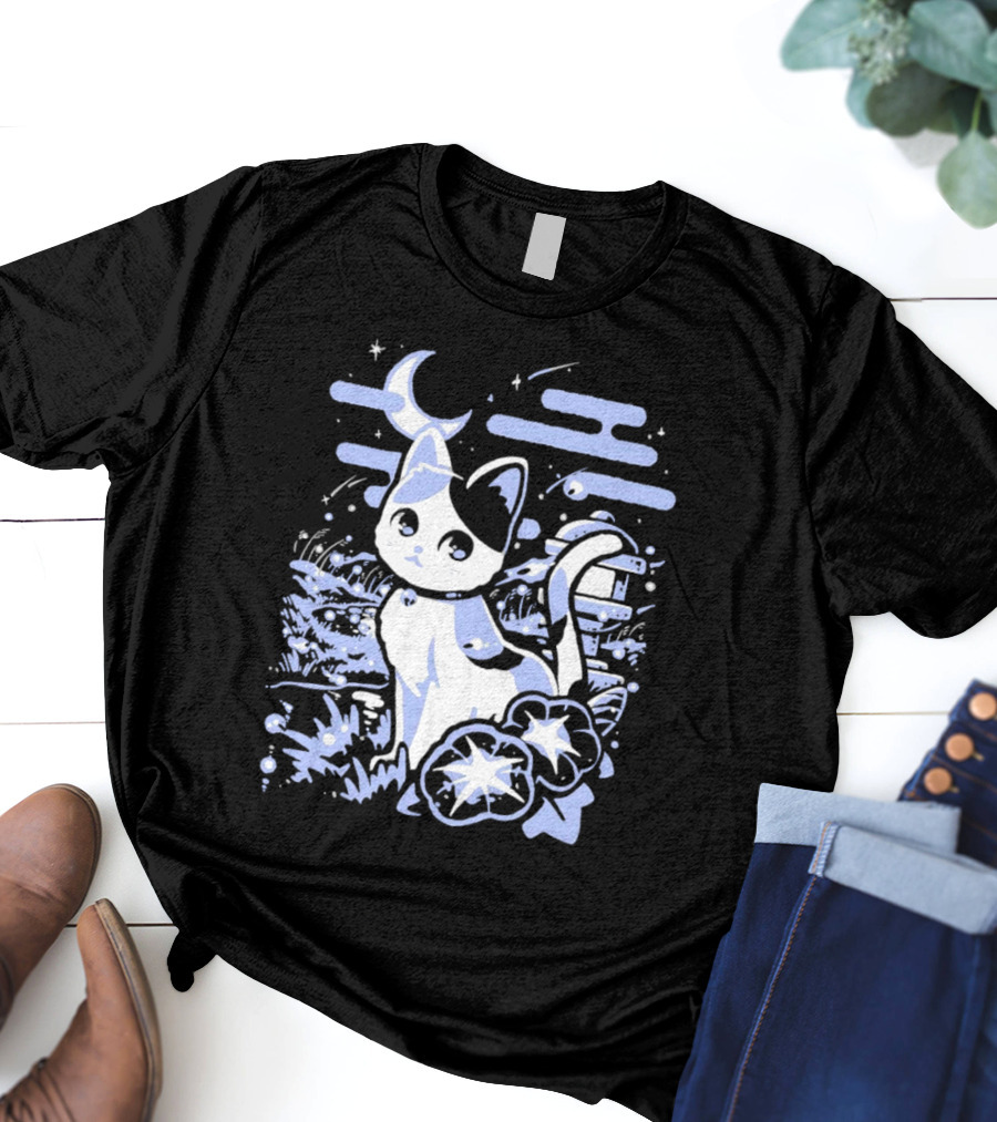 A Cat Amidst Moonlit Fireflies and Stars Shirt made from 100% pre-shrunk ring-spun cotton, unisex regular fit based on U.S. standard sizing. The shirt is designed, cut, sewn, and printed in the United States. Available in sizes S-5XL.