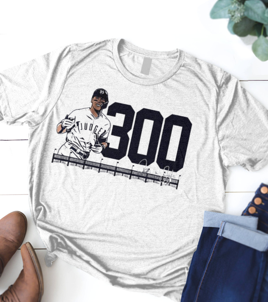 Aaron Judge 300 Career Home Runs Yankees Signature Shirt made from 100% pre-shrunk ring-spun cotton, unisex regular fit based on U.S. standard sizing. The shirt is designed, cut, sewn, and printed in the United States. Available in sizes S-5XL.