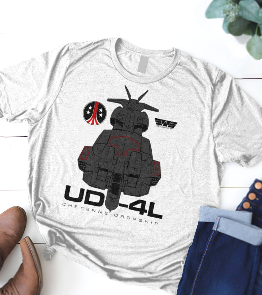 Alien UD-4L Cheyenne Dropship Weyland Yutani Corporation Badge Shirt made from 100% pre-shrunk ring-spun cotton, unisex regular fit based on U.S. standard sizing. The shirt is designed, cut, sewn, and printed in the United States. Available in sizes S-5XL.