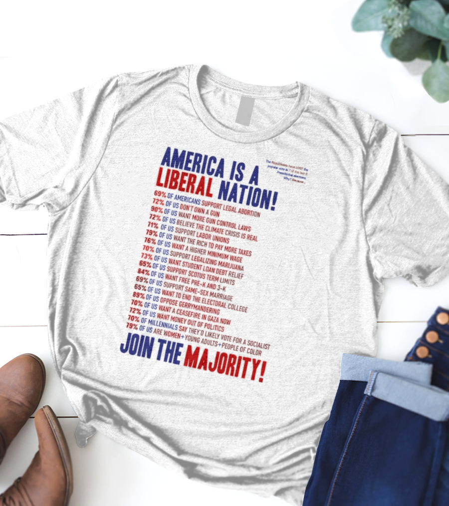 America is a Liberal Nation 69% of Americans Support Legal Abortion Join the Majority Shirt made from 100% pre-shrunk ring-spun cotton, unisex regular fit based on U.S. standard sizing. The shirt is designed, cut, sewn, and printed in the United States. Available in sizes S-5XL.