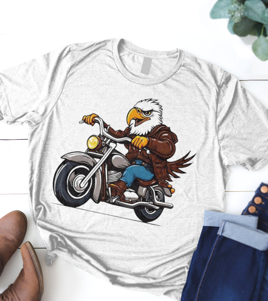 Eagle Riding Motorcycle in Brown Jacket and Blue Jeans Shirt made from 100% pre-shrunk ring-spun cotton, unisex regular fit based on U.S. standard sizing. The shirt is designed, cut, sewn, and printed in the United States. Available in sizes S-5XL.