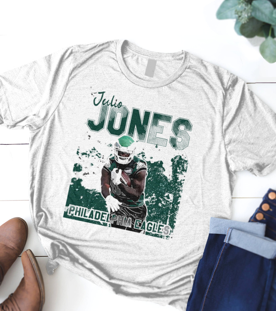 Julio Jones Philadelphia Eagles Shirt made from 100% pre-shrunk ring-spun cotton, unisex regular fit based on U.S. standard sizing. The shirt is designed, cut, sewn, and printed in the United States. Available in sizes S-5XL.