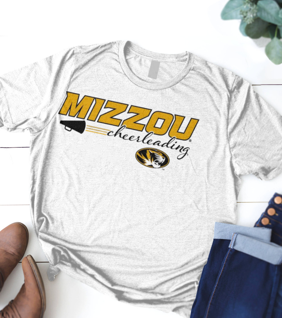 Mizzou Cheerleading Megaphone Oval Tiger Head Shirt made from 100% pre-shrunk ring-spun cotton, unisex regular fit based on U.S. standard sizing. The shirt is designed, cut, sewn, and printed in the United States. Available in sizes S-5XL.
