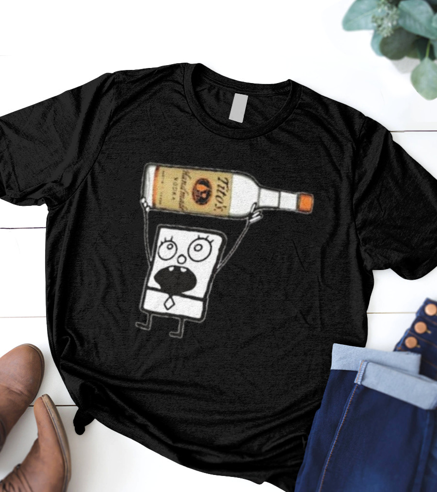 Doodlebob Holding Tito's Handmade Vodka Bottle Shirt made from 100% pre-shrunk ring-spun cotton, unisex regular fit based on U.S. standard sizing. The shirt is designed, cut, sewn, and printed in the United States. Available in sizes S-5XL.
