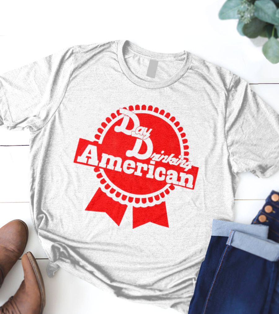 Day Drinking American Red Ribbon Badge Shirt made from 100% pre-shrunk ring-spun cotton, unisex regular fit based on U.S. standard sizing. The shirt is designed, cut, sewn, and printed in the United States. Available in sizes S-5XL.