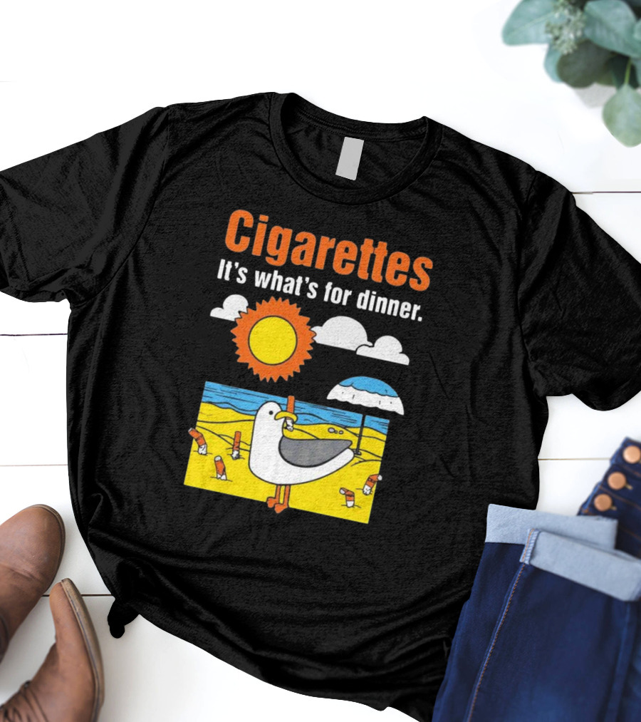 Cigarettes It's What's For Dinner Beach Seagull Cartoon with Sun and Umbrella Shirt made from 100% pre-shrunk ring-spun cotton, unisex regular fit based on U.S. standard sizing. The shirt is designed, cut, sewn, and printed in the United States. Available in sizes S-5XL.