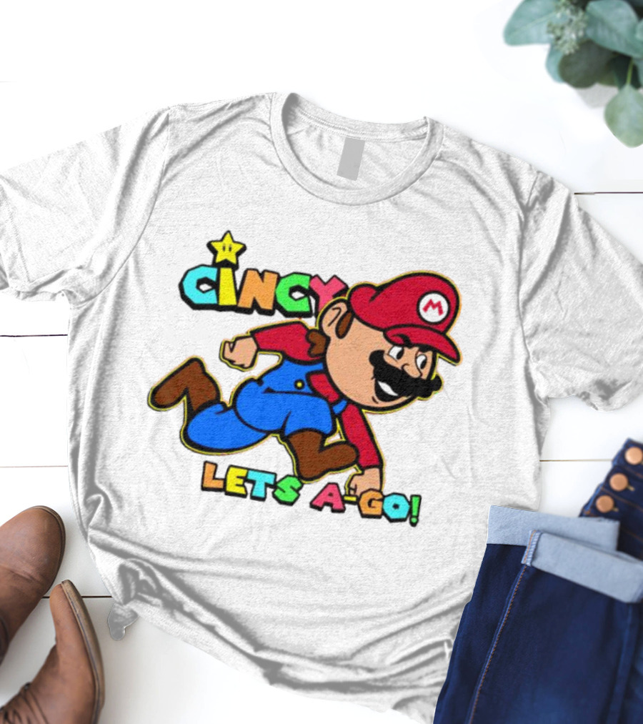 Cincy Let's A-Go Mr Mario Cincinnati Shirt made from 100% pre-shrunk ring-spun cotton, unisex regular fit based on U.S. standard sizing. The shirt is designed, cut, sewn, and printed in the United States. Available in sizes S-5XL.