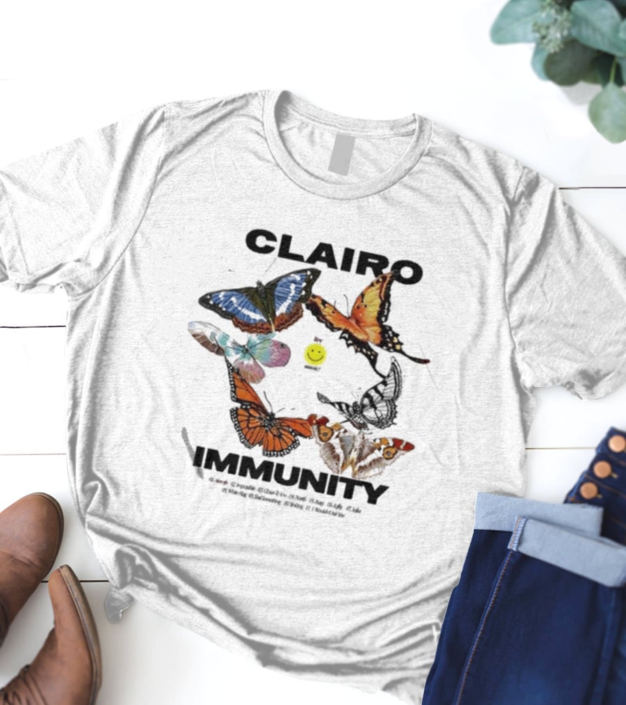 Clairo Immunity Butterfly Smiley Shirt made from 100% pre-shrunk ring-spun cotton, unisex regular fit based on U.S. standard sizing. The shirt is designed, cut, sewn, and printed in the United States. Available in sizes S-5XL.