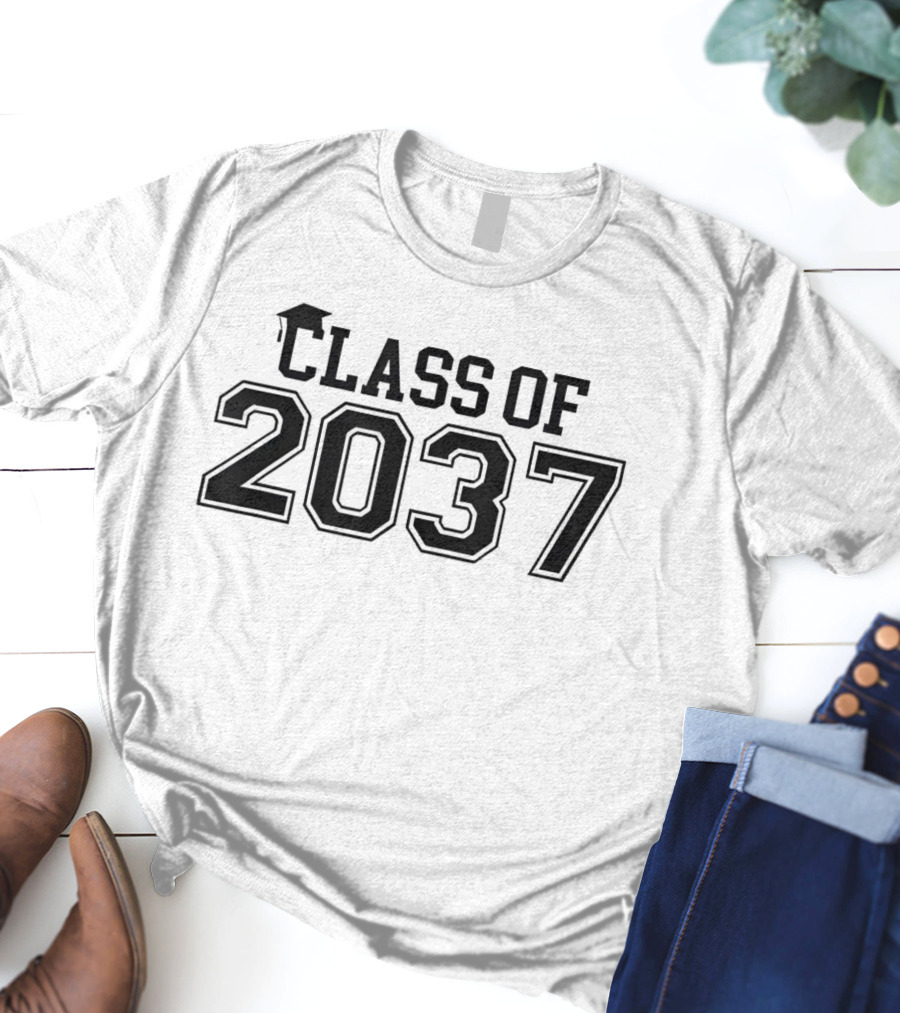 Class of 2037 Graduation Cap Shirt made from 100% pre-shrunk ring-spun cotton, unisex regular fit based on U.S. standard sizing. The shirt is designed, cut, sewn, and printed in the United States. Available in sizes S-5XL.