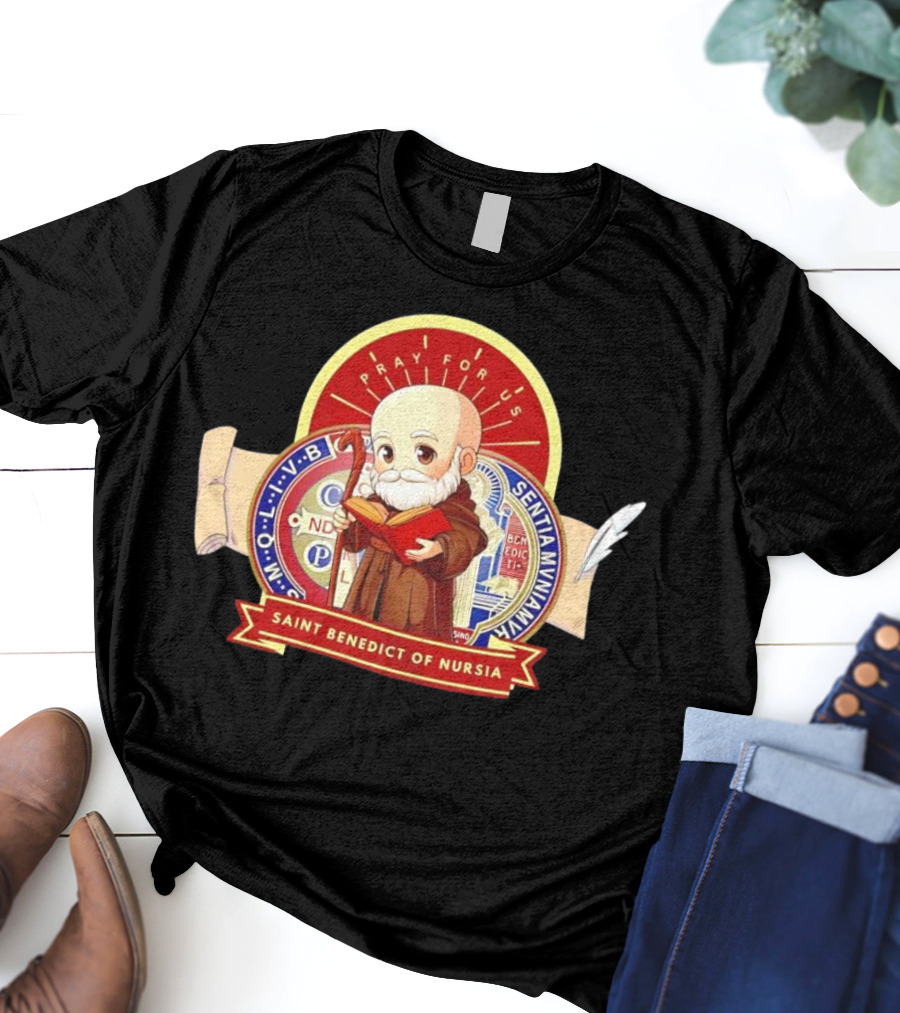 Saint Benedict of Nursia Pray for Us Cartoon M O L I V B Senitas Munian E I V B Benedict II O S Smqlv X O P S V R S M Q L I V B P A X C S P B Shirt made from 100% pre-shrunk ring-spun cotton, unisex regular fit based on U.S. standard sizing. The shirt is designed, cut, sewn, and printed in the United States. Available in sizes S-5XL.