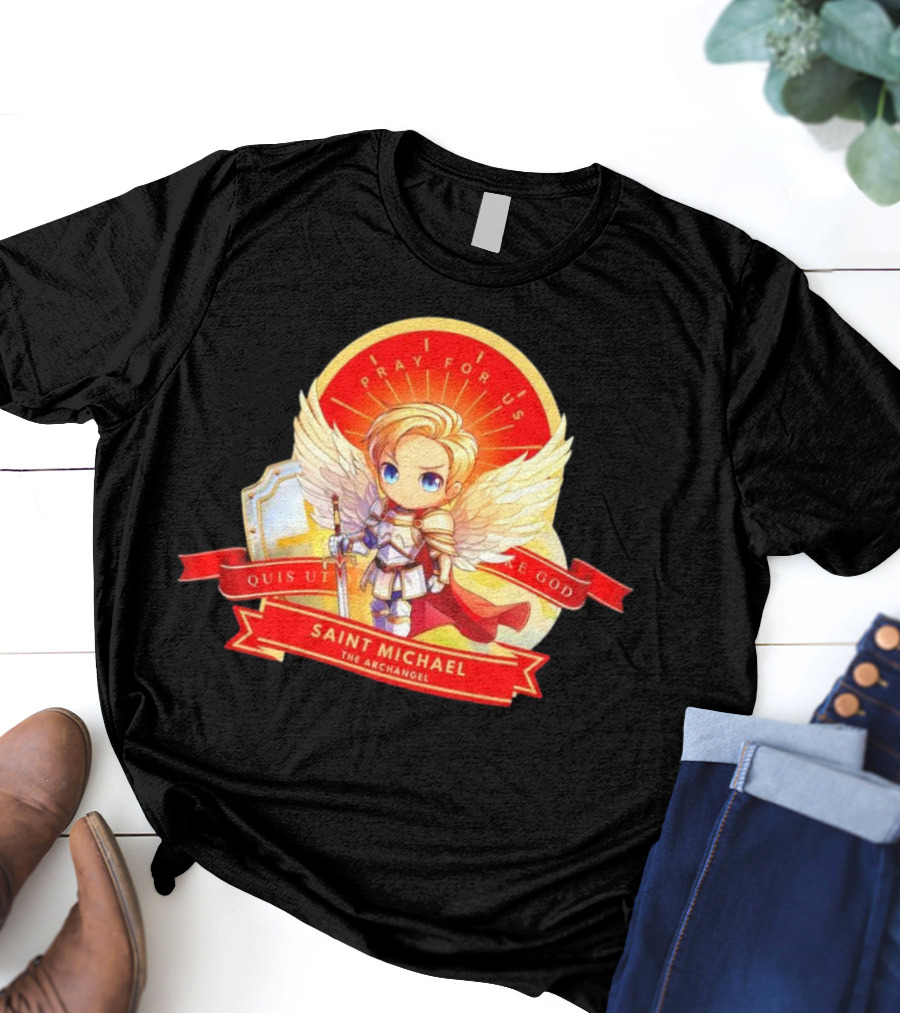 Saint Michael the Archangel Pray for Us Quis Ut Deus Cartoon Shirt made from 100% pre-shrunk ring-spun cotton, unisex regular fit based on U.S. standard sizing. The shirt is designed, cut, sewn, and printed in the United States. Available in sizes S-5XL.