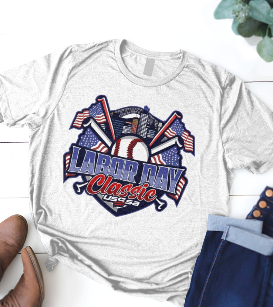 Labor Day Classic USSSA Baseball Crossed Bats And American Flag Themed Shield Logo T-Shirt