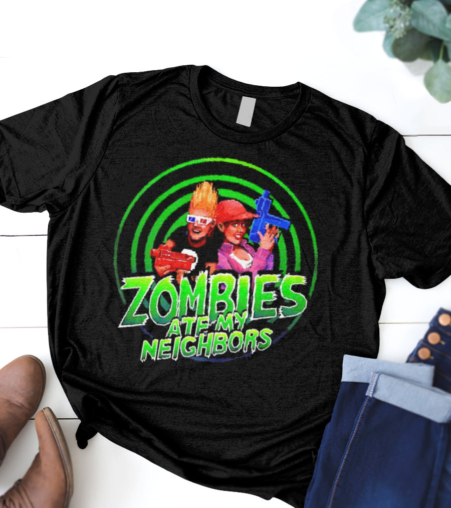 Zombies Ate My Neighbors Zombie Hunters Game Retro Style 90s Arcade Action Kids with Toy Blasters Shirt made from 100% pre-shrunk ring-spun cotton, unisex regular fit based on U.S. standard sizing. The shirt is designed, cut, sewn, and printed in the United States. Available in sizes S-5XL.