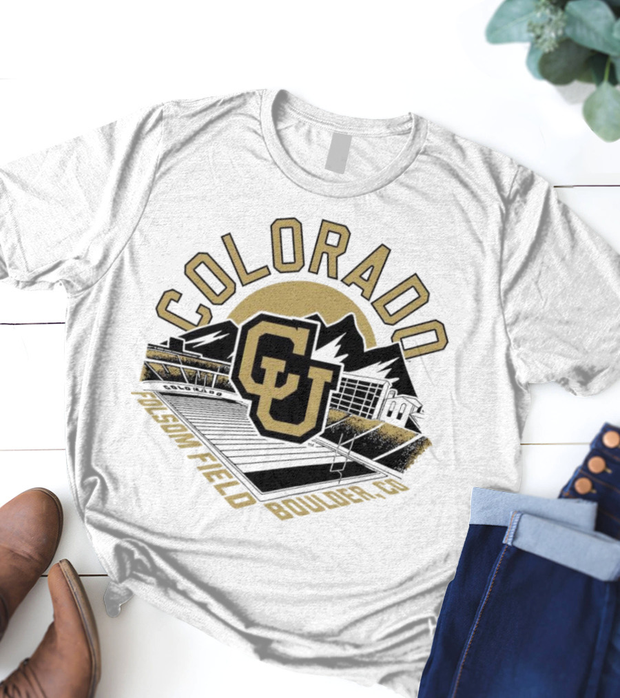 Colorado Buffaloes CU Folsom Field Boulder Stadium Shirt made from 100% pre-shrunk ring-spun cotton, unisex regular fit based on U.S. standard sizing. The shirt is designed, cut, sewn, and printed in the United States. Available in sizes S-5XL.