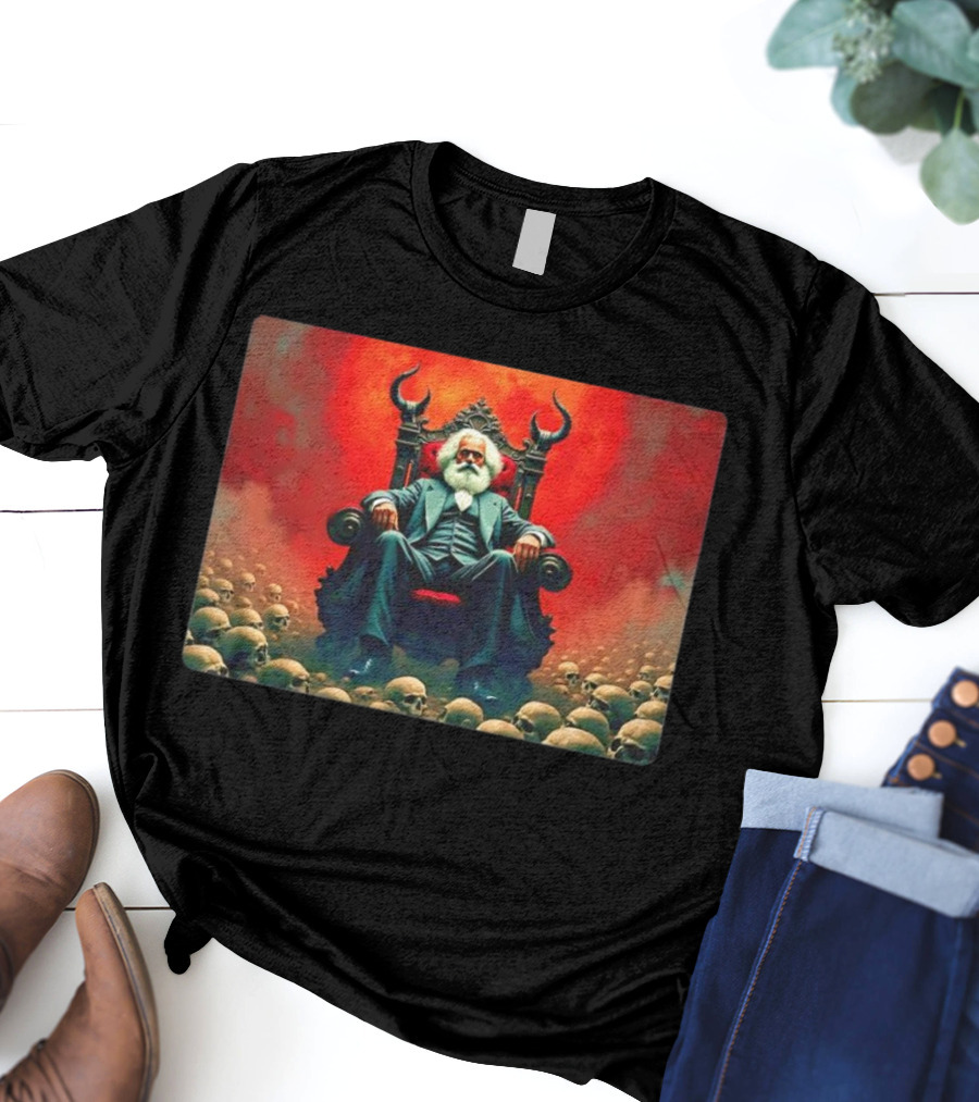 Communists Want to Abolish Intellectual Property Karl Marx Throne of Skulls and Flames Shirt made from 100% pre-shrunk ring-spun cotton, unisex regular fit based on U.S. standard sizing. The shirt is designed, cut, sewn, and printed in the United States. Available in sizes S-5XL.