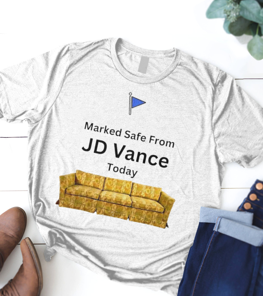 Marked Safe From JD Vance Today Yellow Floral Sofa Shirt made from 100% pre-shrunk ring-spun cotton, unisex regular fit based on U.S. standard sizing. The shirt is designed, cut, sewn, and printed in the United States. Available in sizes S-5XL.