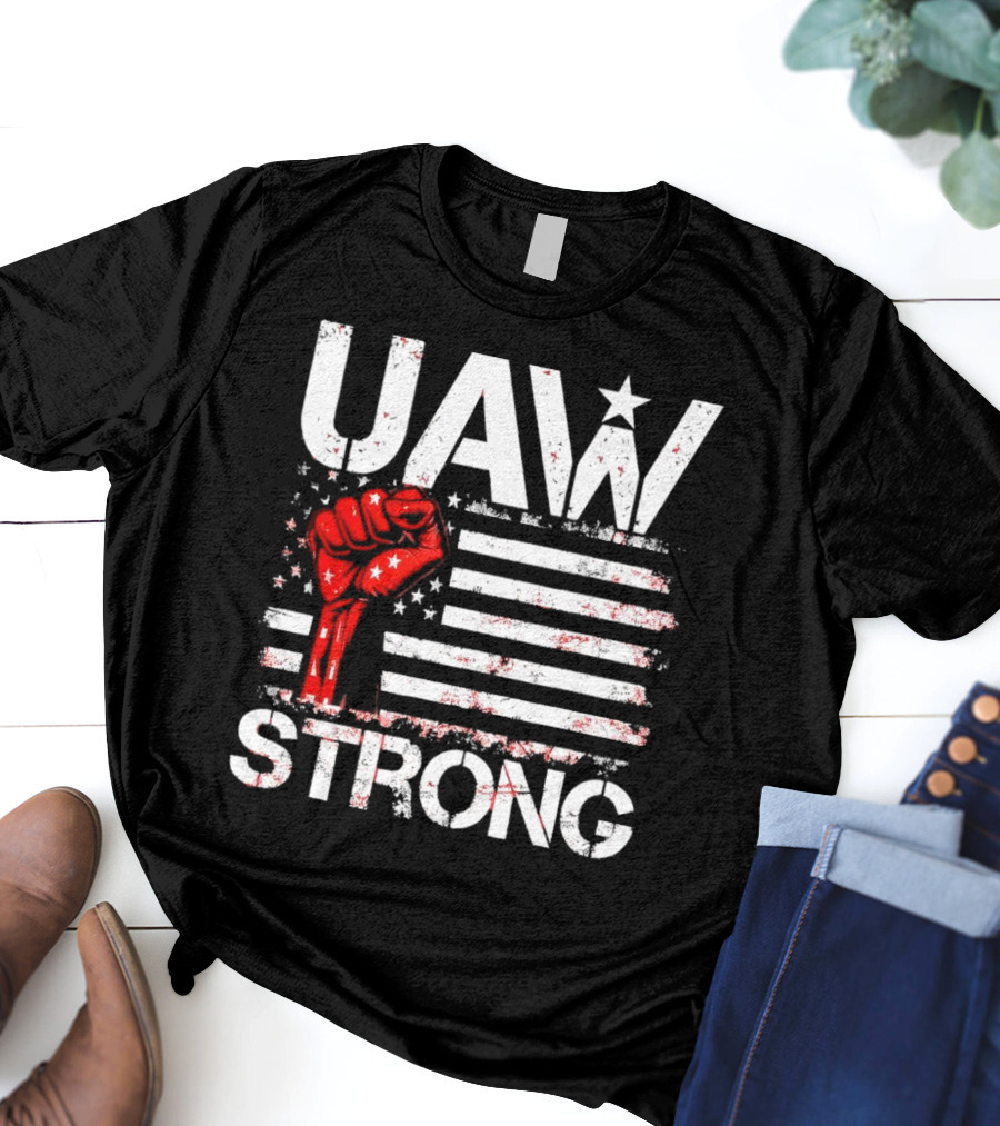 UAW Strong Red Fist American Flag Shirt made from 100% pre-shrunk ring-spun cotton, unisex regular fit based on U.S. standard sizing. The shirt is designed, cut, sewn, and printed in the United States. Available in sizes S-5XL.