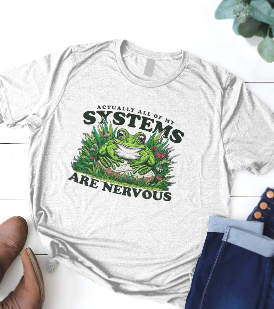 Actually All of My Systems Are Nervous Frog in Grass and Flowers Shirt made from 100% pre-shrunk ring-spun cotton, unisex regular fit based on U.S. standard sizing. The shirt is designed, cut, sewn, and printed in the United States. Available in sizes S-5XL.