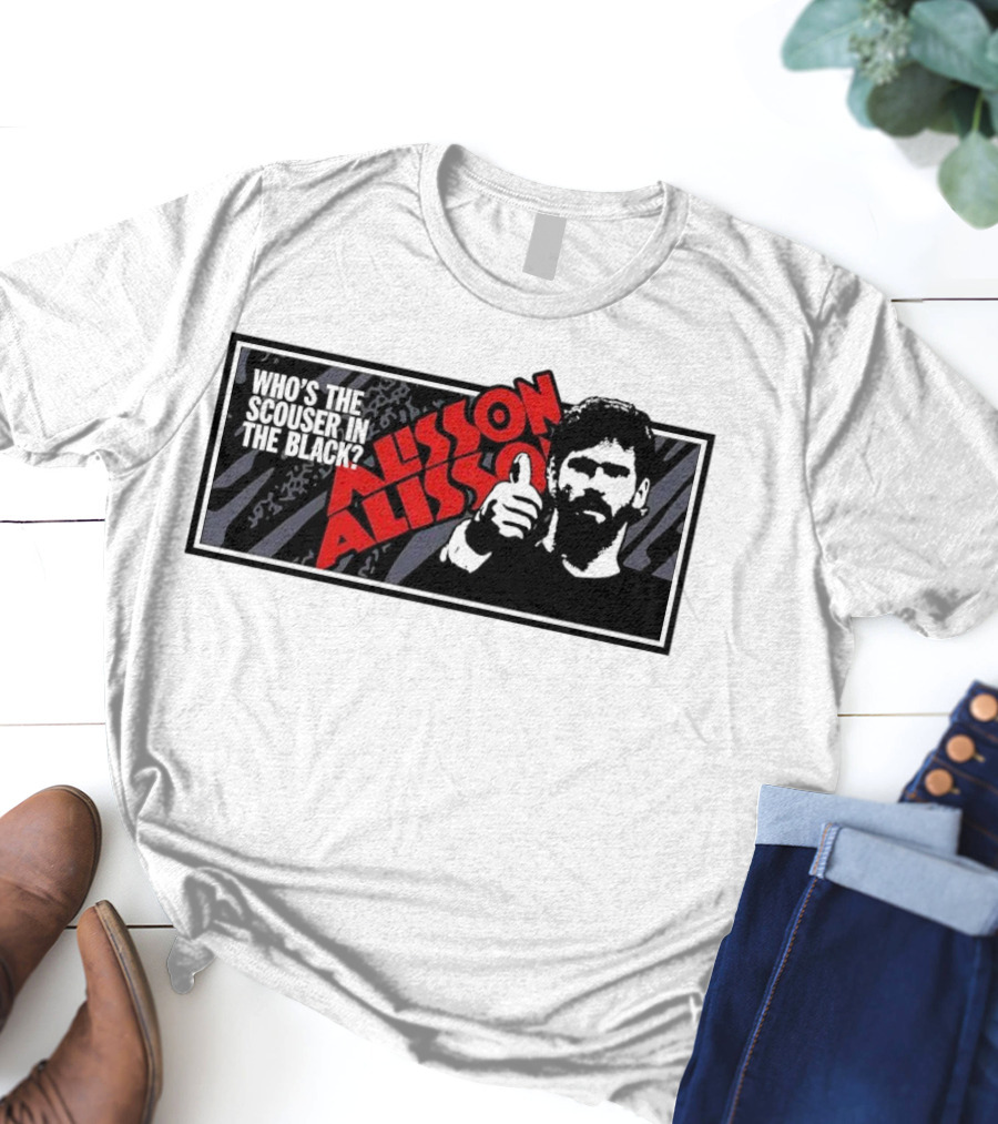 Who's the Scouser in the Black Alisson Alisson Shirt made from 100% pre-shrunk ring-spun cotton, unisex regular fit based on U.S. standard sizing. The shirt is designed, cut, sewn, and printed in the United States. Available in sizes S-5XL.