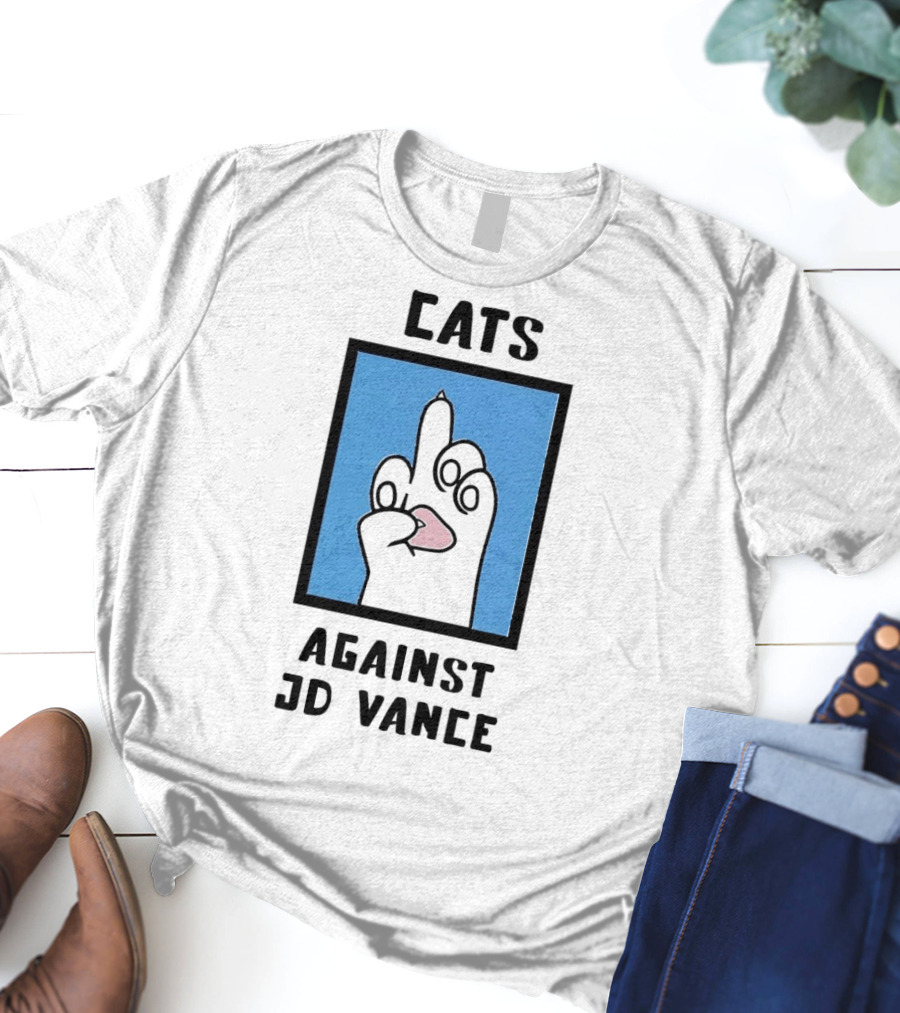 Cats Against JD Vance Middle Finger Paw Drawing Shirt made from 100% pre-shrunk ring-spun cotton, unisex regular fit based on U.S. standard sizing. The shirt is designed, cut, sewn, and printed in the United States. Available in sizes S-5XL.