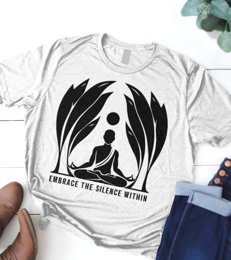 Embrace The Silence Within Meditation Silhouette and Enigmatic Leafy Eyes Shirt made from 100% pre-shrunk ring-spun cotton, unisex regular fit based on U.S. standard sizing. The shirt is designed, cut, sewn, and printed in the United States. Available in sizes S-5XL.