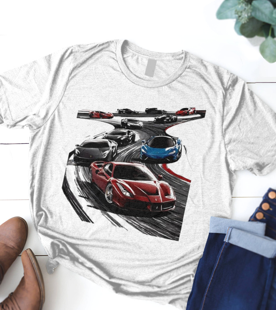 Furious Speed Race Cars Ferrari Lamborghini McLaren Track Racing Shirt made from 100% pre-shrunk ring-spun cotton, unisex regular fit based on U.S. standard sizing. The shirt is designed, cut, sewn, and printed in the United States. Available in sizes S-5XL.