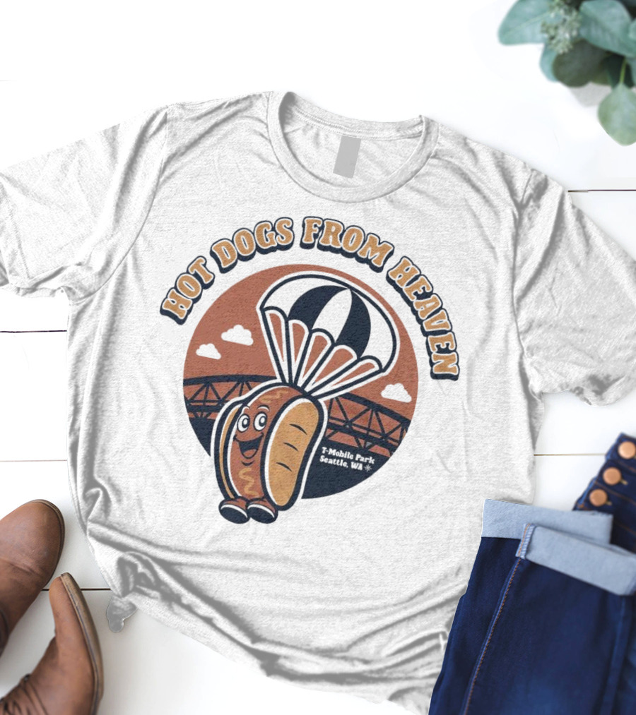 Hot Dogs from Heaven Parachuting Smiling Hot Dog over Bridge Shirt made from 100% pre-shrunk ring-spun cotton, unisex regular fit based on U.S. standard sizing. The shirt is designed, cut, sewn, and printed in the United States. Available in sizes S-5XL.