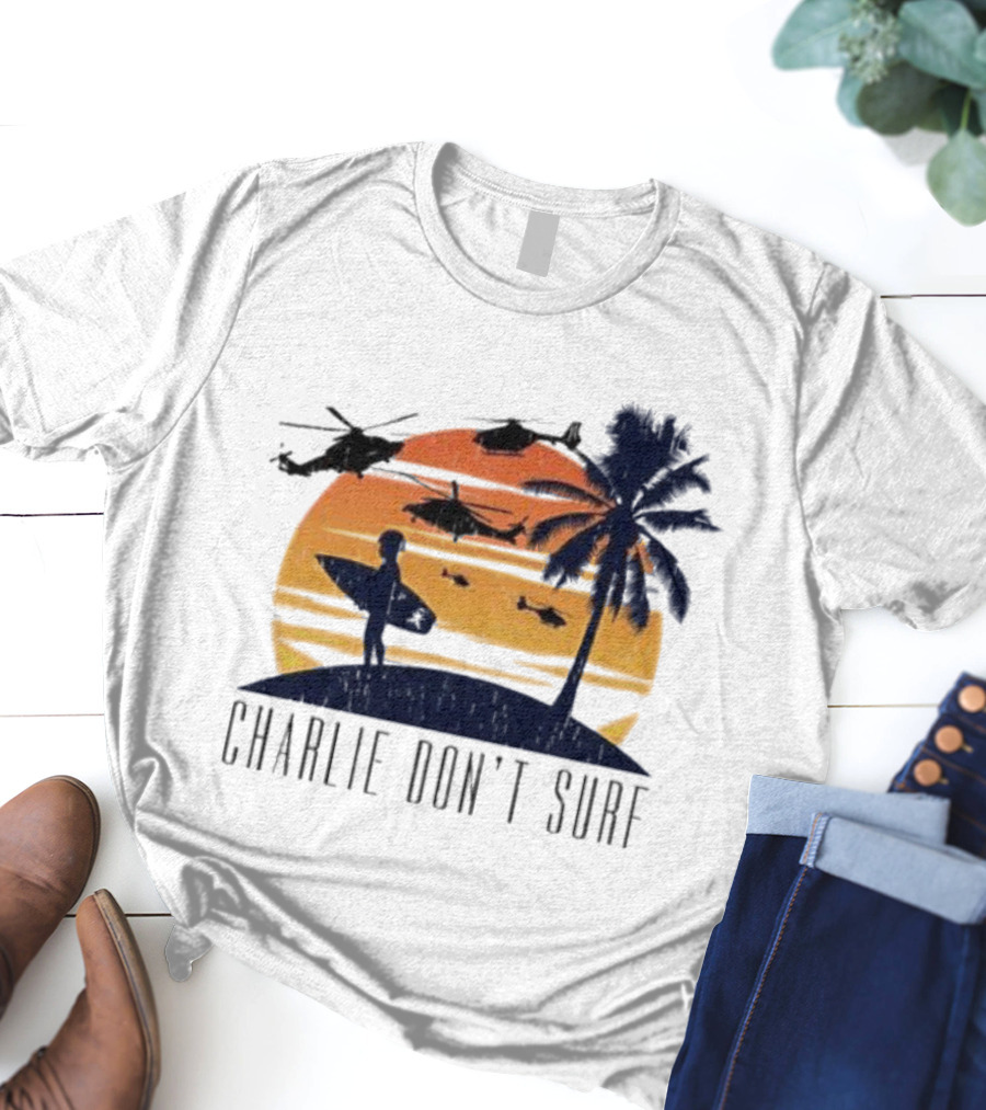 Charlie Don’t Surf Helicopters Palm Sunset Surfer T-Shirt