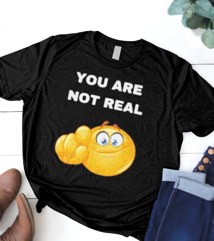 YOU ARE NOT REAL Smiling Emoji Pointing Finger Shirt made from 100% pre-shrunk ring-spun cotton, unisex regular fit based on U.S. standard sizing. The shirt is designed, cut, sewn, and printed in the United States. Available in sizes S-5XL.