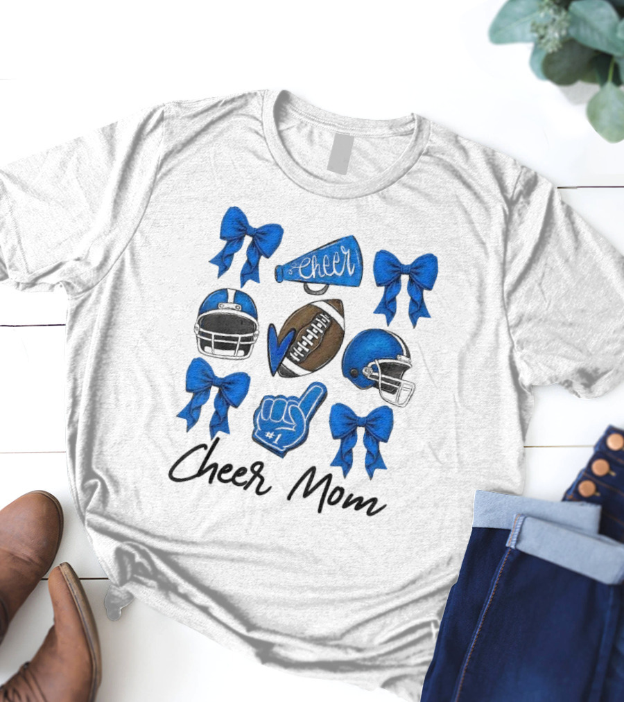 Cheer Mom Era Pom Cheer Leopard Football Coquette Bow Blue Shirt made from 100% pre-shrunk ring-spun cotton, unisex regular fit based on U.S. standard sizing. The shirt is designed, cut, sewn, and printed in the United States. Available in sizes S-5XL.